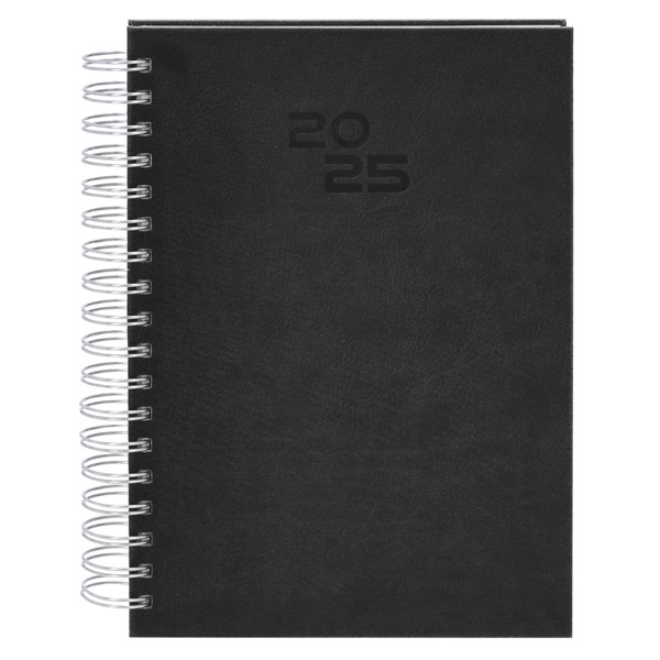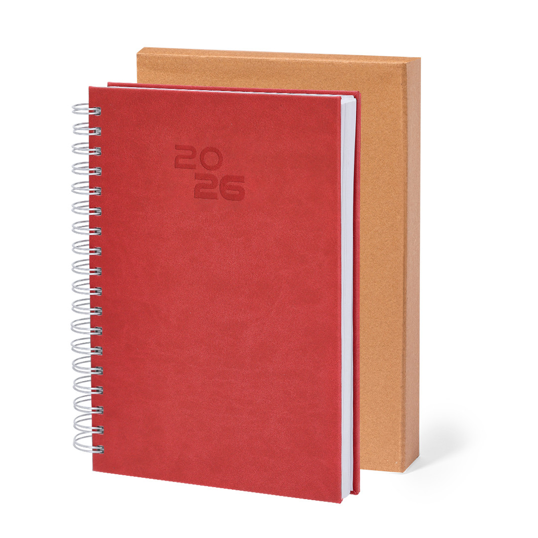Diário tamanho B5 com anel de fichário em couro PU macio e resistente, com capas duras. Inclui uma caixa de apresentação em kraft.Design de página por dia e páginas com canto recortado. Em 2 idiomas: espanhol e inglês. Página Dia. Caixa de Apresentação Incluída