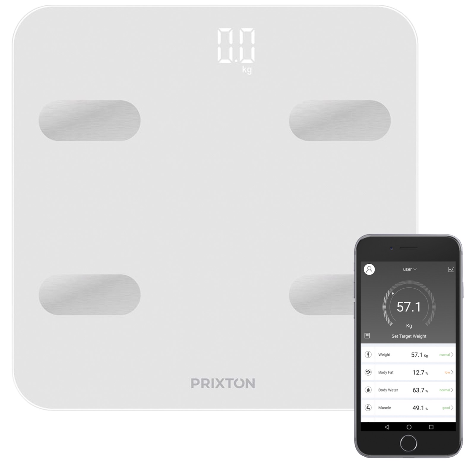 Balança com 13 funções para monitorização através de aplicação: gordura corporal, água corporal, percentagem muscular, massa óssea, BMR, IMC, gordura visceral, peso padrão, controlo de peso, massa gorda, massa magra. A aplicação apresenta o peso em quilogramas e em libras. Bluetooth integrado. Ecrã LCD branco. Pilha AAA. Peso máximo de 180 kg.