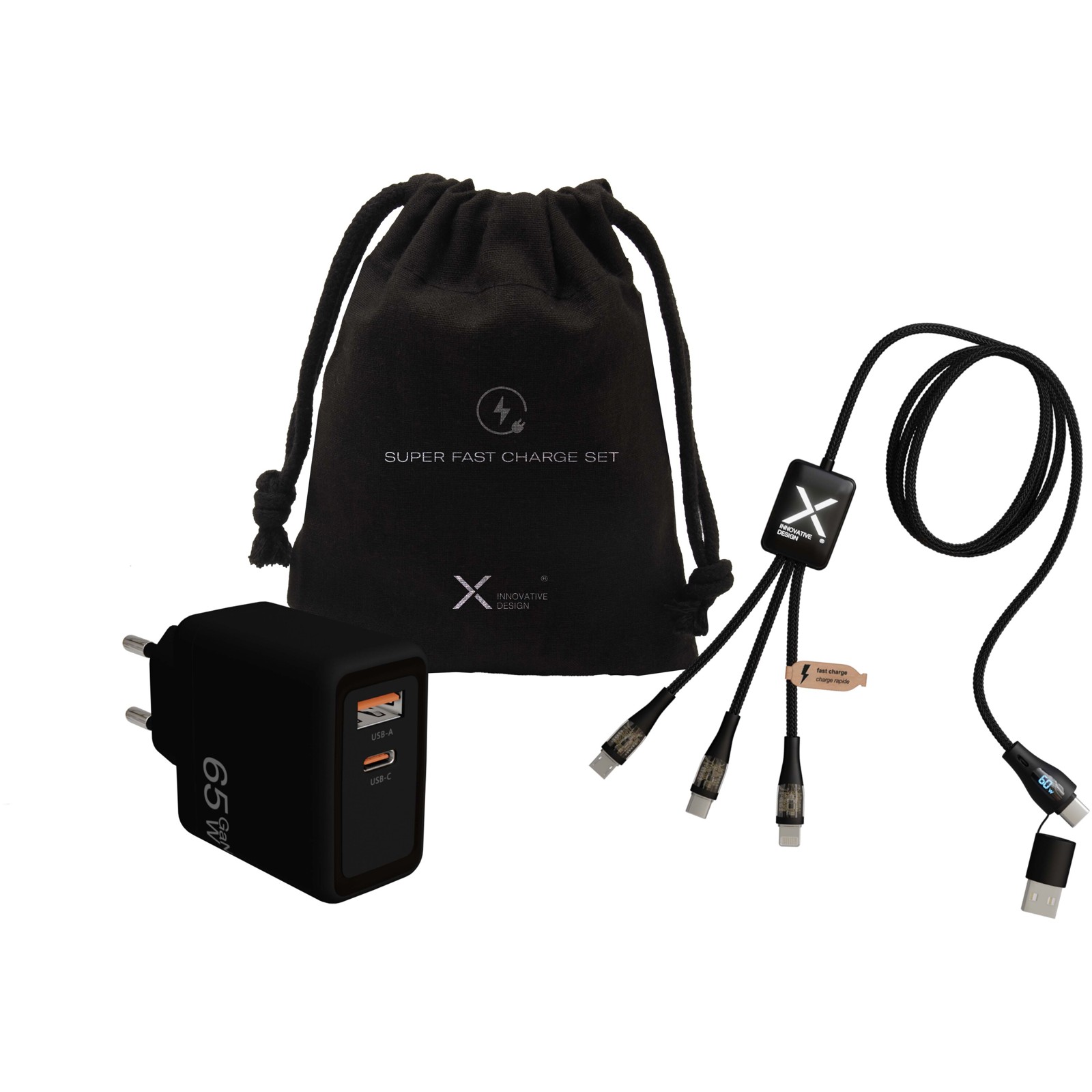 Carregue todos os seus dispositivos com a máxima velocidade com este conjunto de carregamento ultracompacto. Inclui um adaptador de 65 W "GaN" com tecnologia PD, um cabo de carregamento rápido 5 em 1 de 60 W de RPET e uma bolsa de algodão preta para um transporte fácil. É perfeito para computadores portáteis, tablets e smartphones, suporta carregamento simultâneo e é totalmente compatível com os dispositivos mais recentes. Comprimento do cabo: 1 metro.