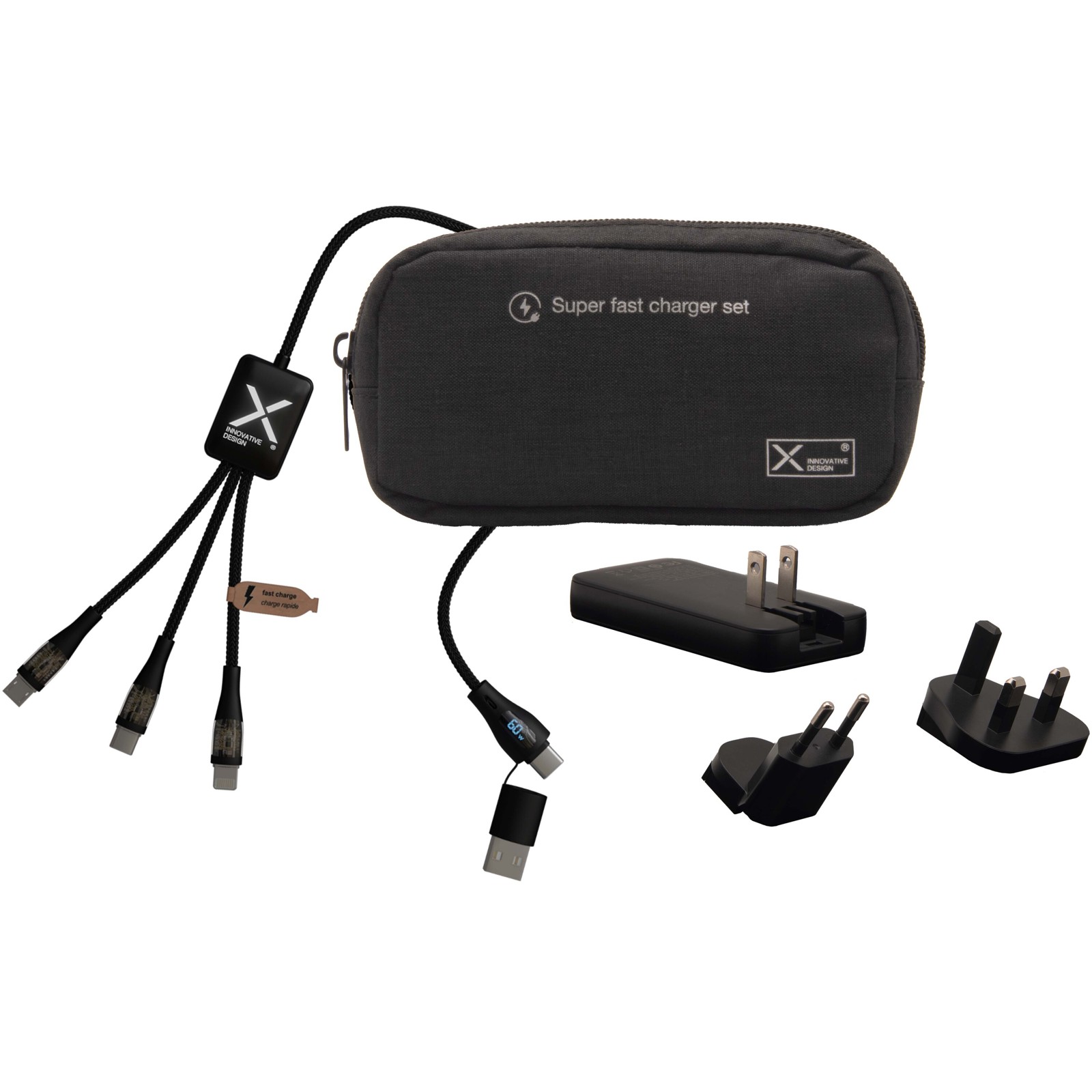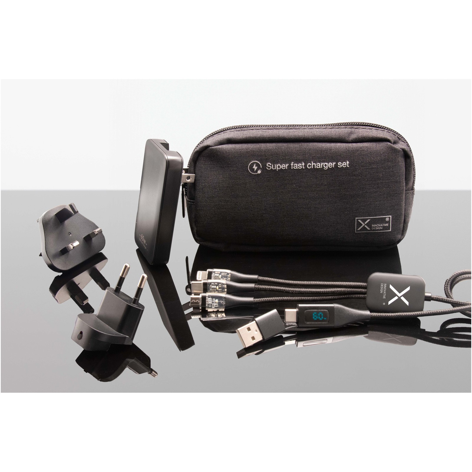Este conjunto de carregamento compacto e portátil inclui um adaptador "GaN" de 65 W com tecnologia PD e tomadas intercambiáveis (EUA/EU/Reino Unido), um cabo de carregamento rápido 5 em 1 de 60 W feito de RPET reciclado e uma bolsa de armazenamento feita de materiais reciclados. Perfeita para carregar vários dispositivos, incluindo computadores, tablets e smartphones, e garantir um carregamento ultrarrápido e eficiente em qualquer lugar. Comprimento do cabo: 1 metro.