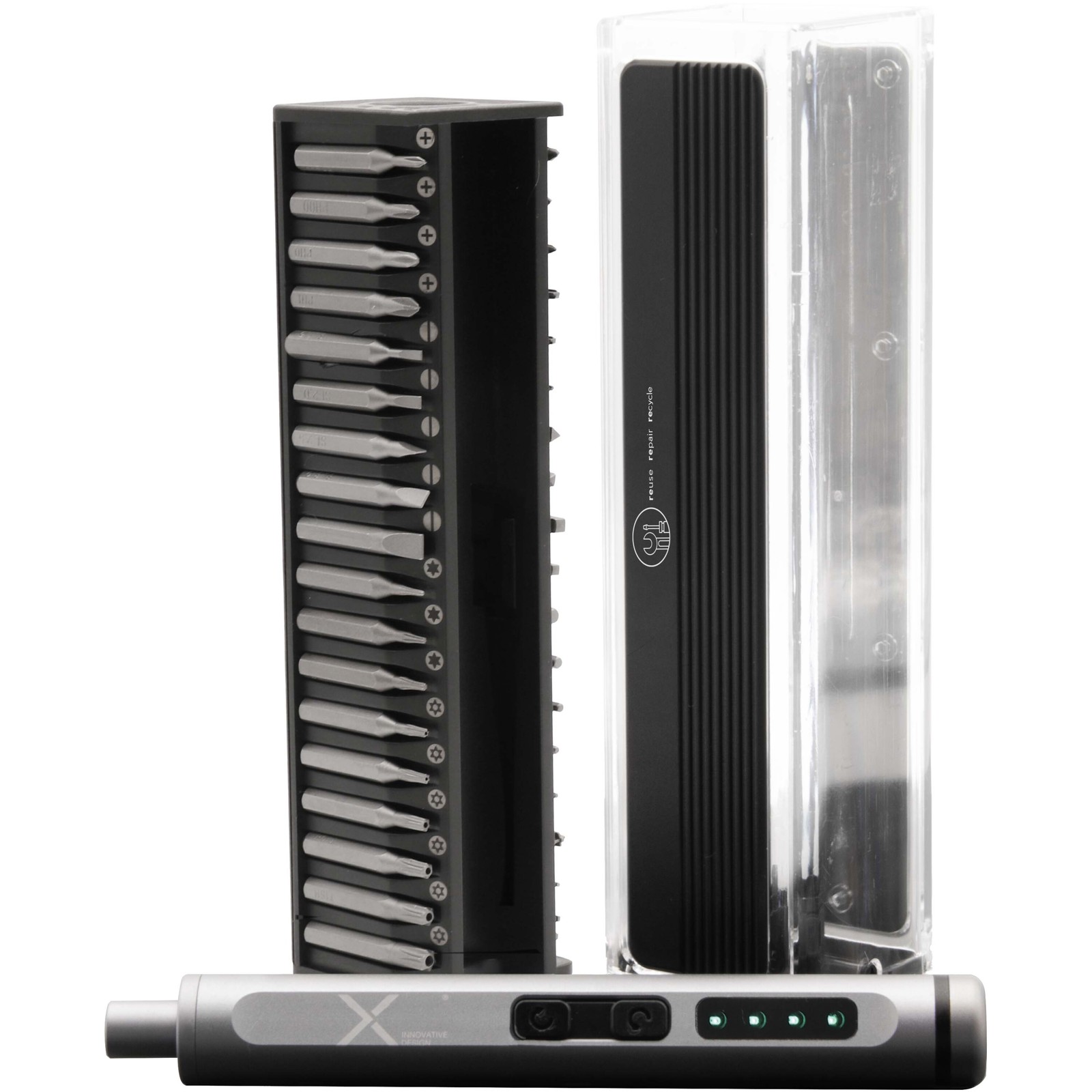 Conjunto com chave de fendas elétrica de alumínio e 40 pontas para conserto de pequenos eletrodomésticos e outras atividades de bricolage. As pontas são atraídas magneticamente para a chave de parafusos. O logótipo "REUSE REPAIR RECYCLE" está gravado na caixa de armazenamento. Entregue numa caixa de presente de cartão reciclada.