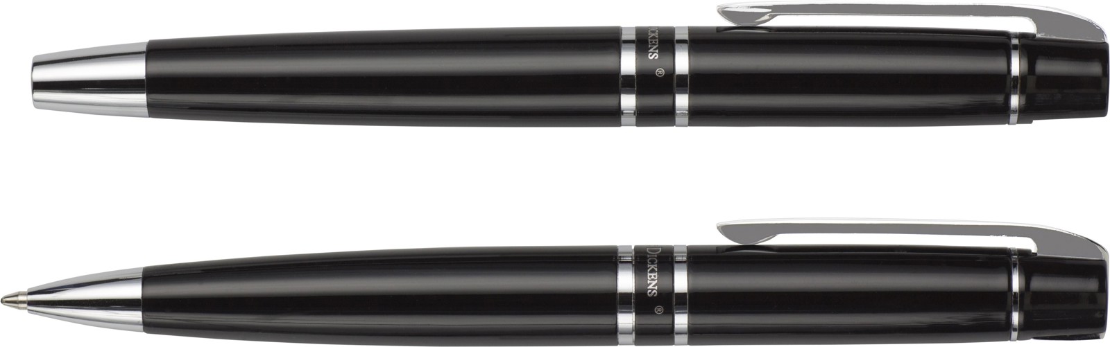 Conjunto de esferográfica com mecanismo giratório e roller de metal lacado em estojo de polipel. Escrita preto.