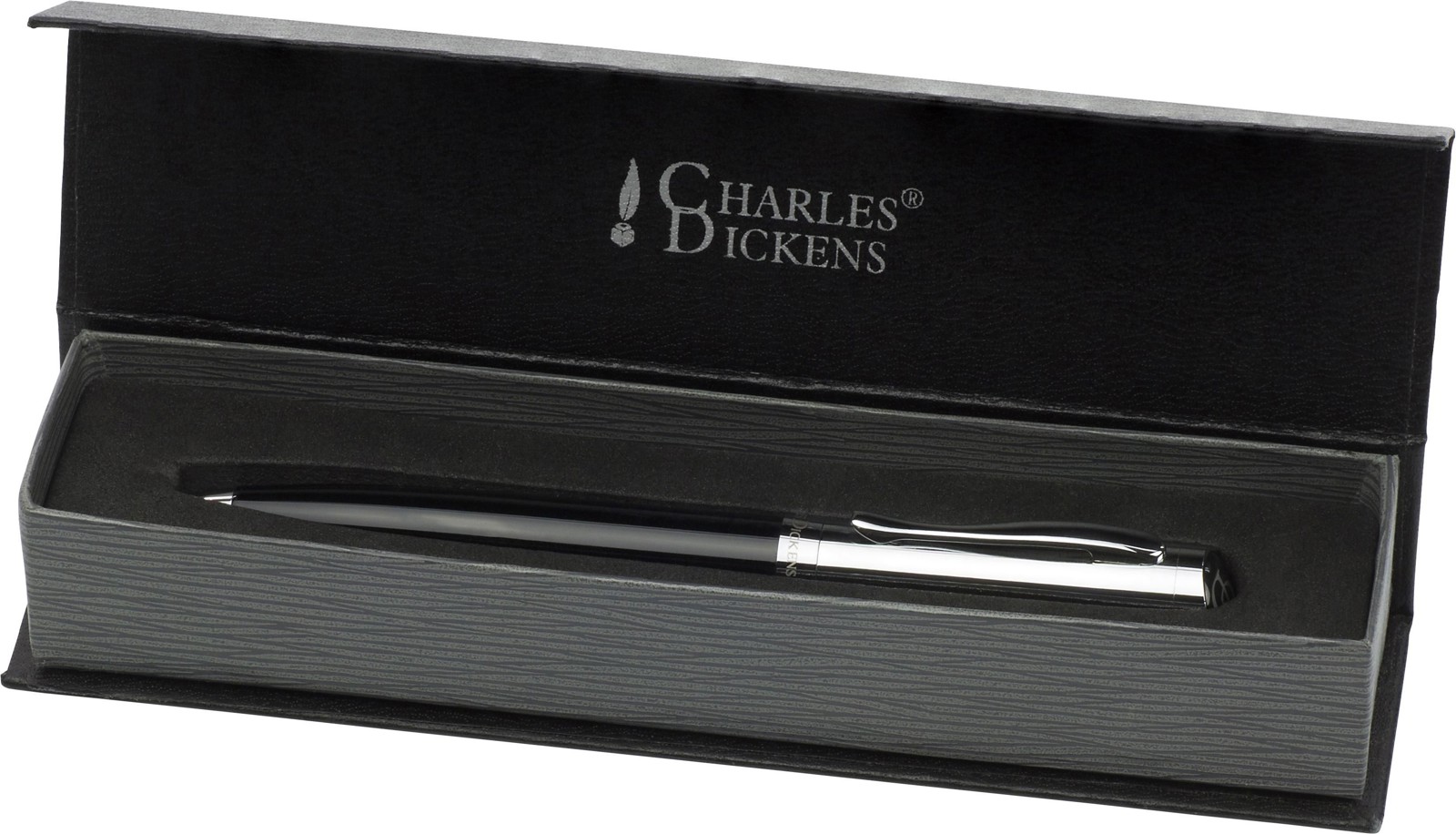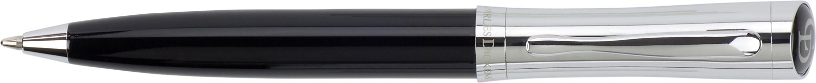 Esferográfica Charles Dickens® com mecanismo giratório. Com capuz cromado e as siglas CD na parte superior. Apresentado em estojo elegante. Escrita preto.