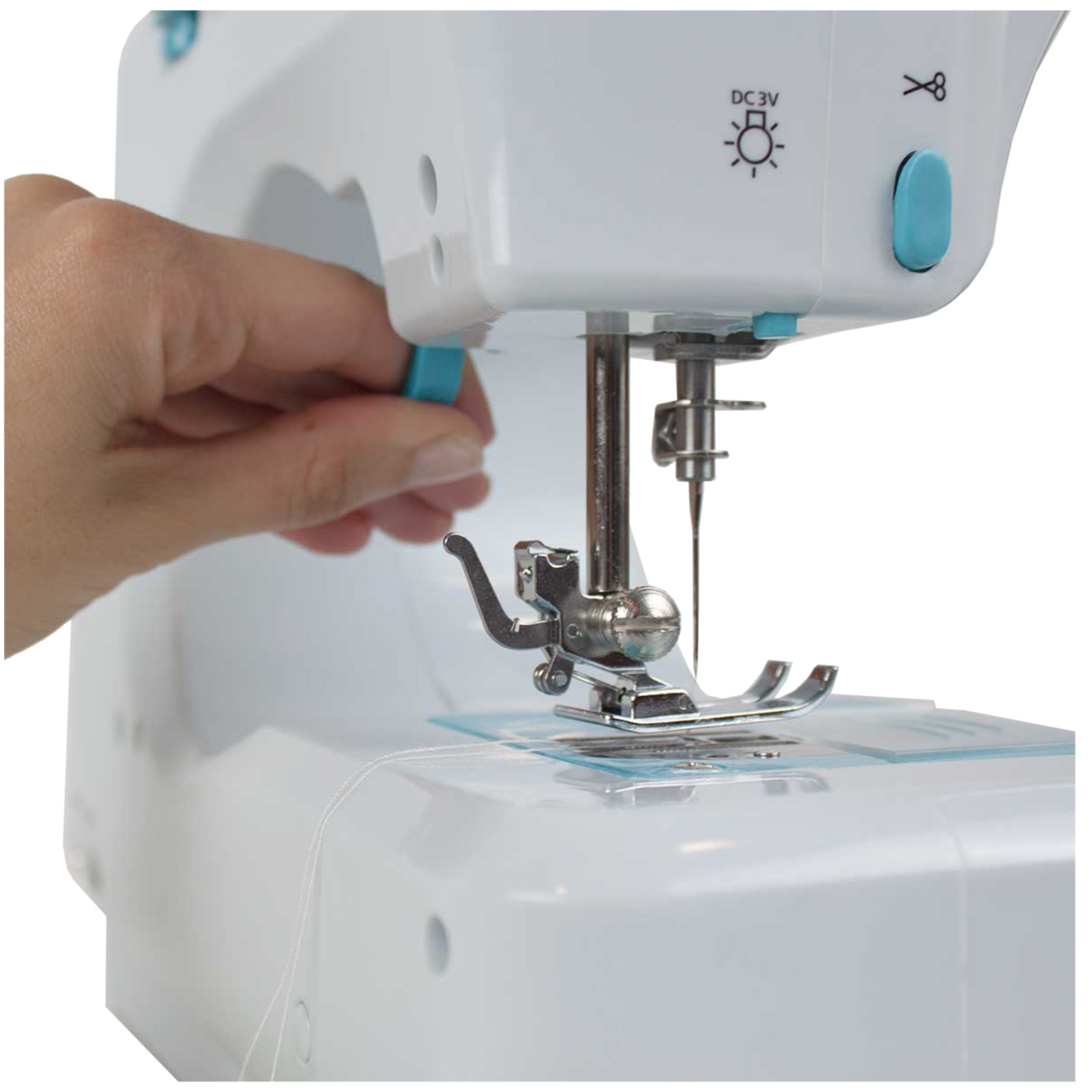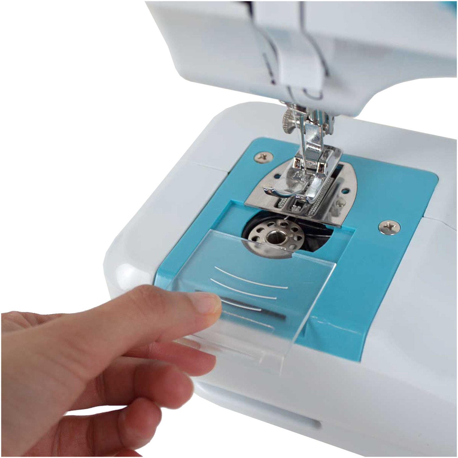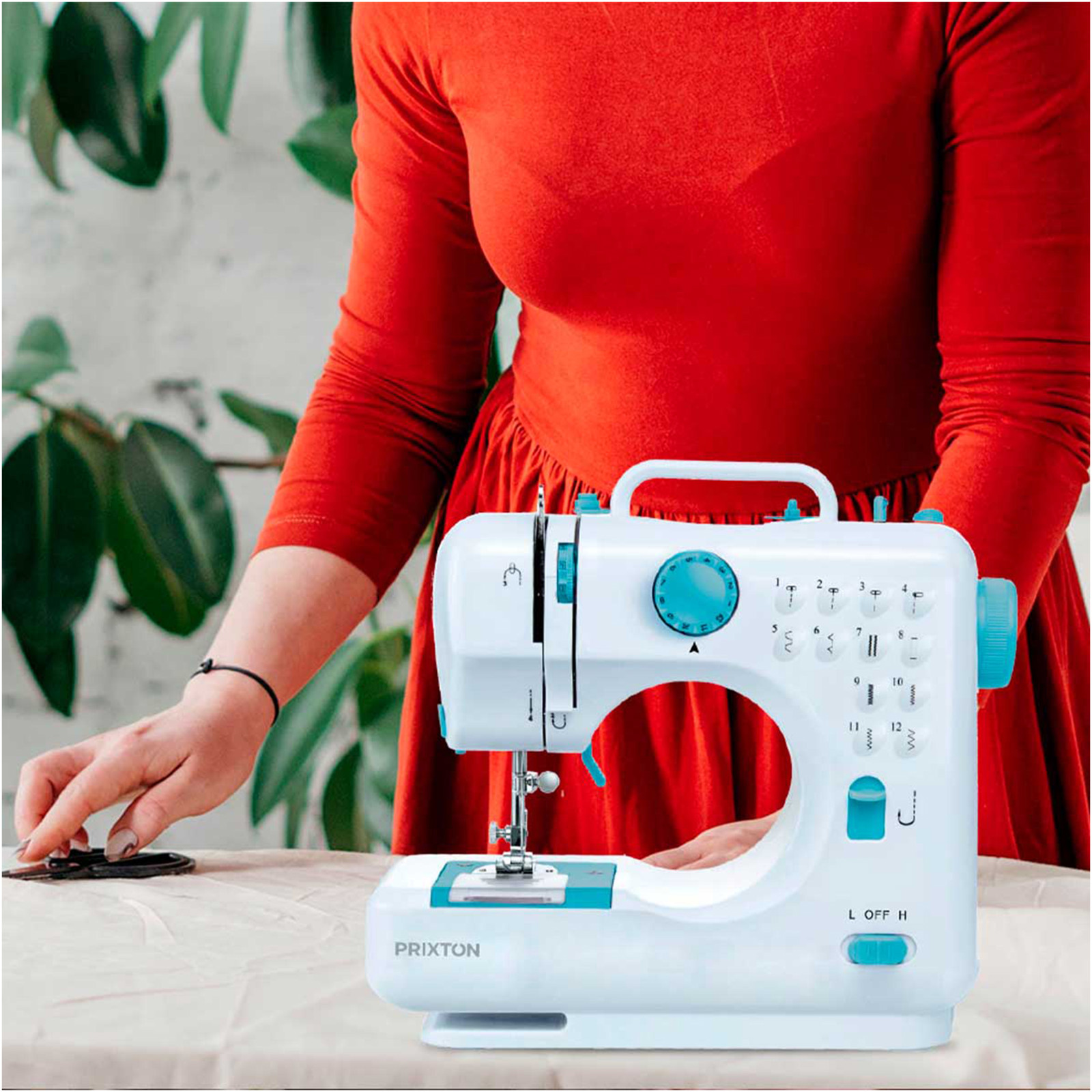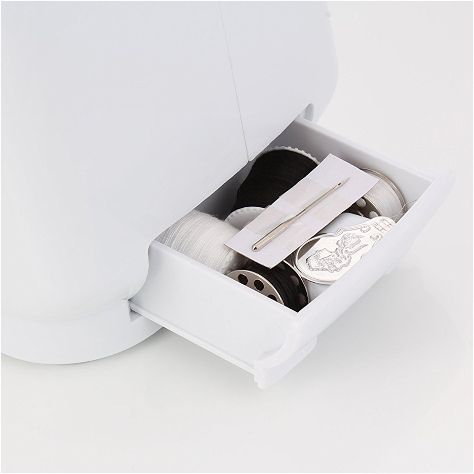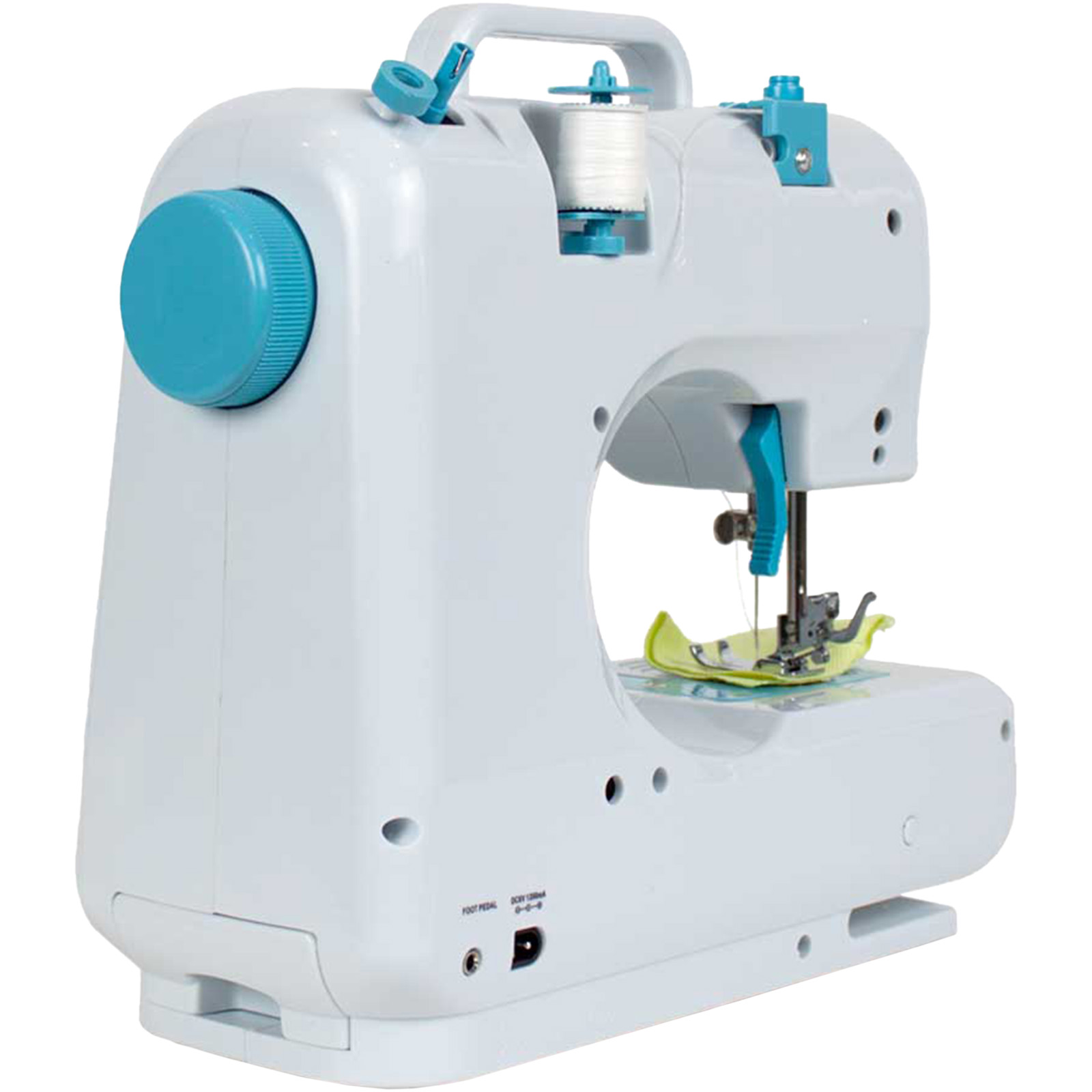 Máquina de costura com 12 padrões de pontos embutidos. Gaveta integrada para armazenar fios, agulhas e outros materiais. Luz para melhorar a visibilidade durante a costura. Inclui pedal e um adaptador. Costura para frente e para trás. A máquina é ligada pelo interruptor manual ou pelo pedal. Pode ser usada conectada à tomada de parede ou com baterias (4XAA). Regulador de tensão. Botão de seleção. Cortador de fios. Volante da bobina.