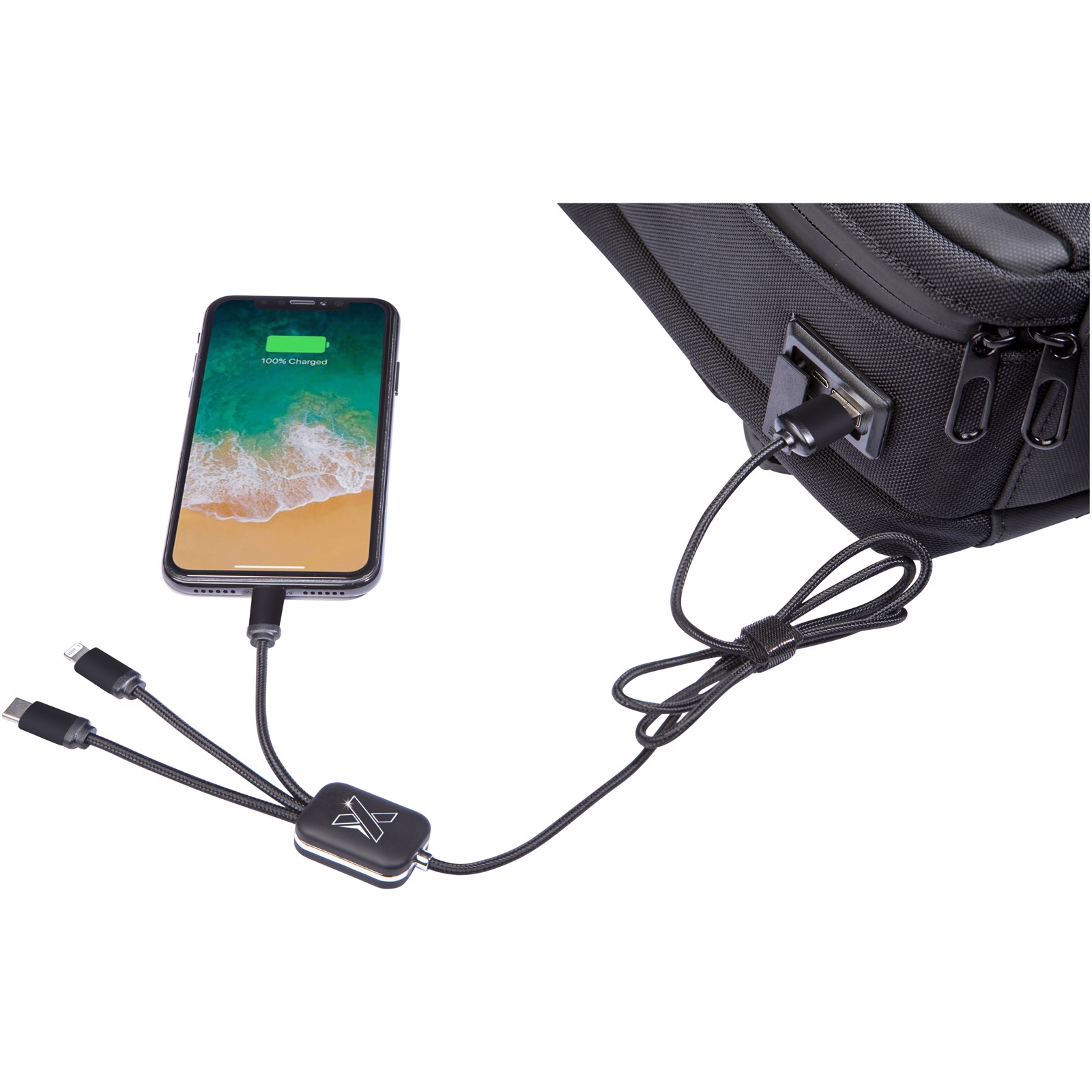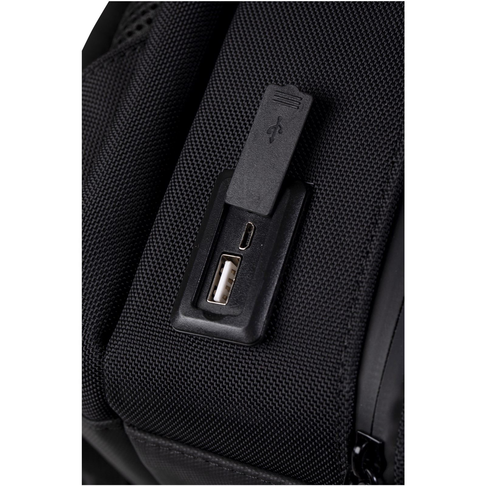 Mochila business feita de garrafas recicladas com cabo em RPET 3 em 1 (tipo C/micro-USB/iPhone). Equipada com uma bateria incorporada de carregamento rápido de 10.000 mAh e um cabo de carregamento com logótipo luminoso. A bateria está ligada a dois conectores externos (USB e Android). Inclui uma bolsa RFID e um sistema de bloqueio com fecho de correr para garantir uma utilização segura. Compartimentos acolchoados para computador portátil e tablet. Inclui ainda uma alça para transporte, bem como um bolso posterior traseiro. Feita de tecido impermeável e RPET. Patente EUROPE EUIPO.
