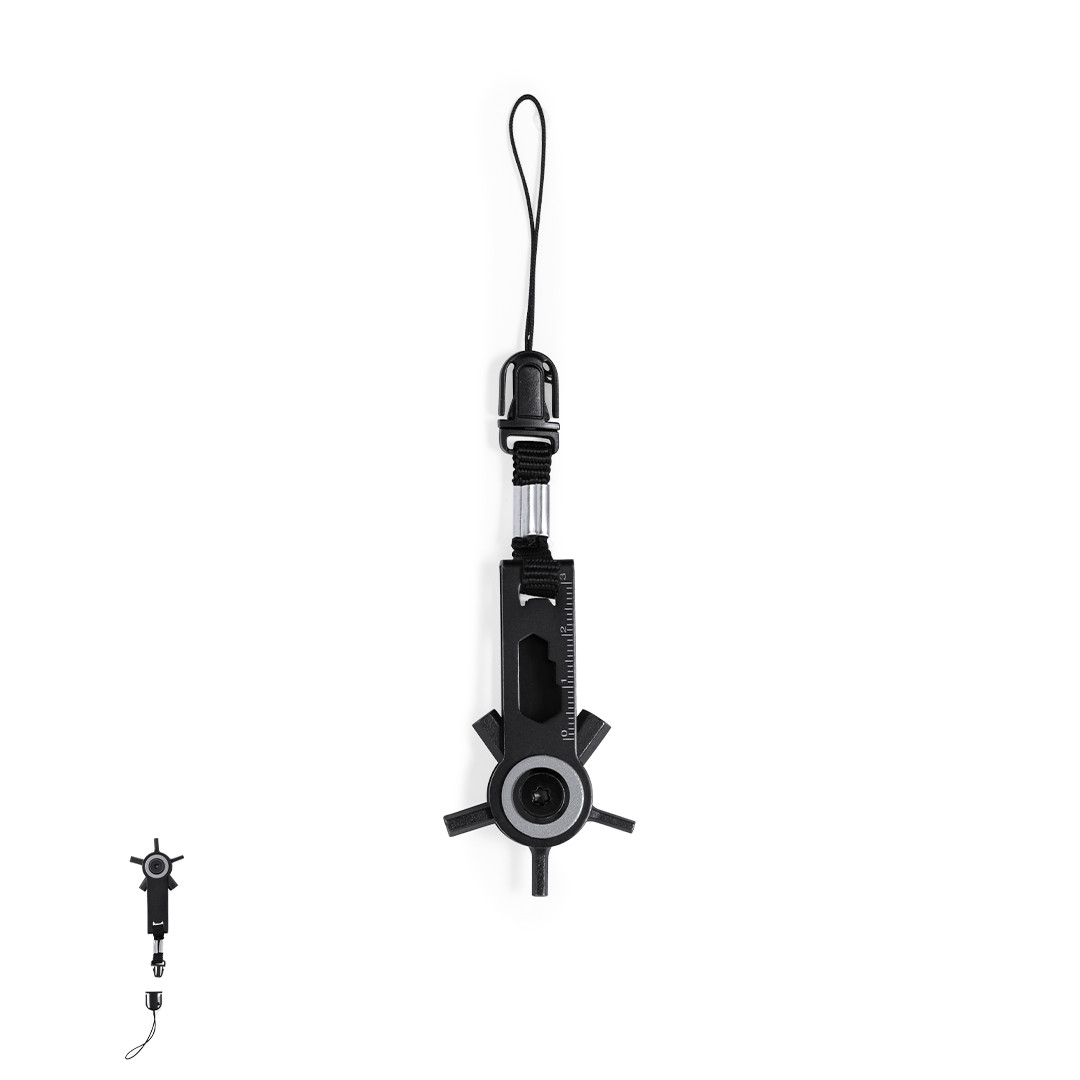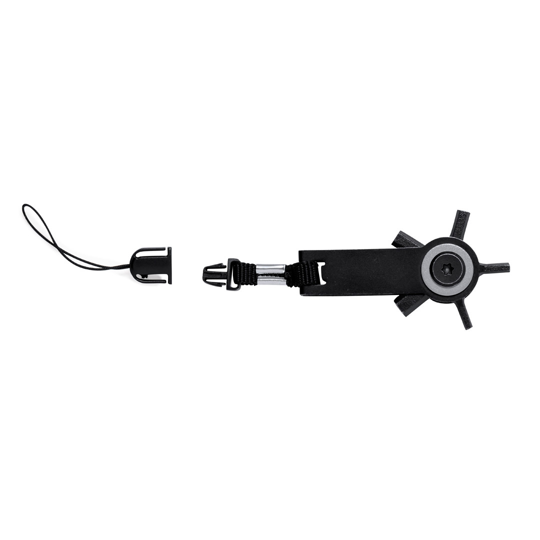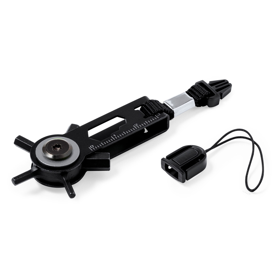 Eficaz aulti-ferramenta com cabeça giratória em aço inoxidável com acabamento em preto. Com 10 funções: chaves allen, chaves sextavadas em vários tamanhos, régua e um prático acessório de transporte com fecho de fivela. Apresentado em bolsa de papel de design kraft reciclada. 10 Funções