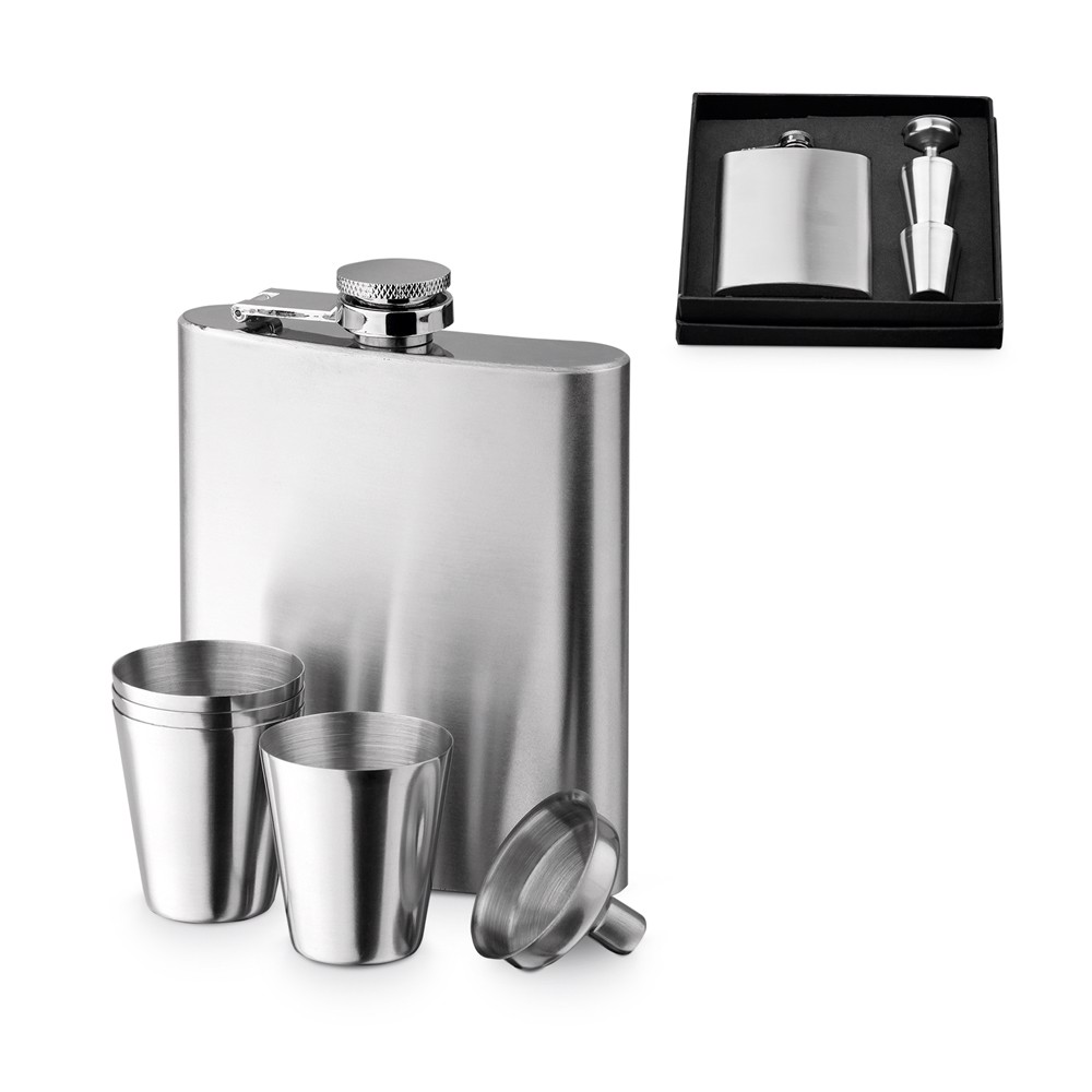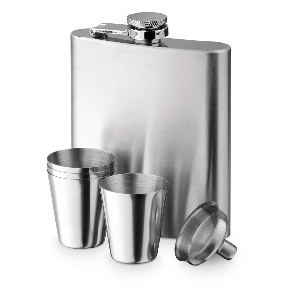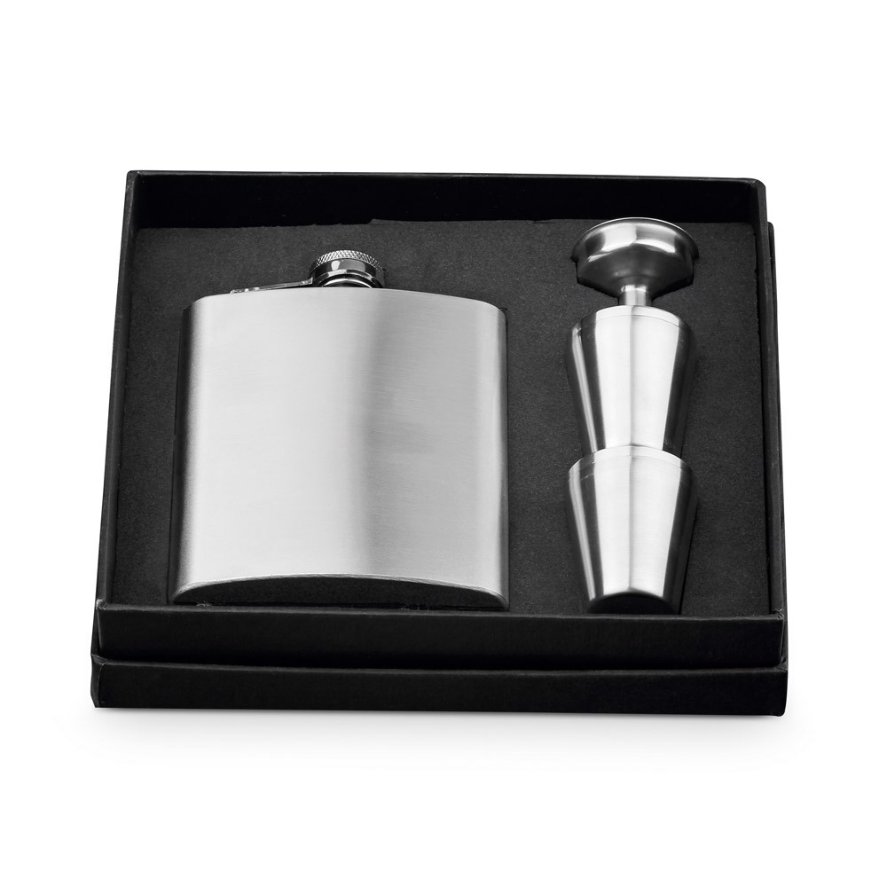 Conjunto de garrafa de bolso em aço inoxidável (200 mL), funil e 4 copos com 20 mL. Fornecido em caixa de oferta. 189 x 40 x 168 mm