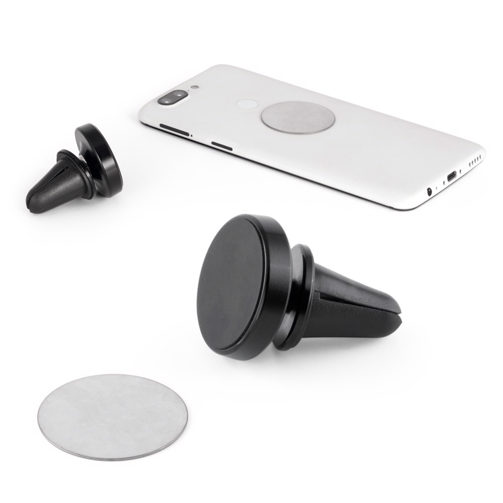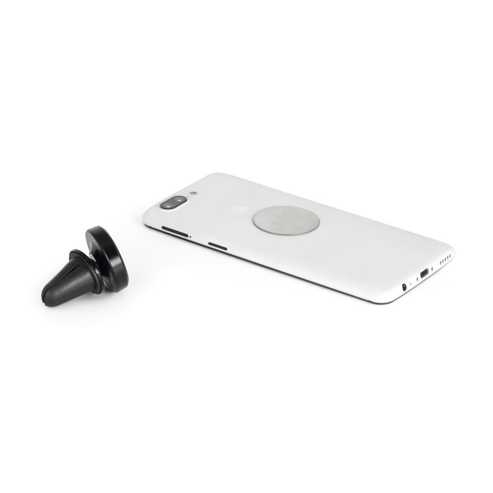 Suporte magnético de smartphone para automóvel com rotação 360º para uma maior versatilidade. Ideal para utilizar funções essenciais, como GPS ou chamadas em alta voz, sempre em segurança. Sistema simples de fixação na grelha de ventilação do automóvel que permite maior conforto e segurança na utilização do dispositivo.Material: ABS e alumínioInclui: grip magnético com autocolante para aderir ao smartphone ou capaFornecimento: Caixa de oferta branca ø35 x 44 mm