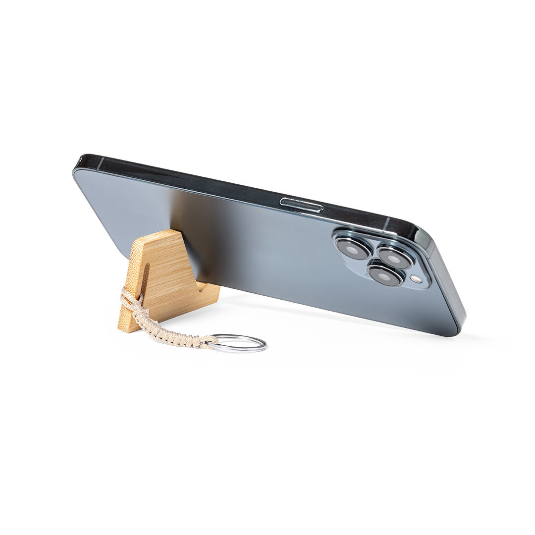 Porta-chaves de linha nature fabricado em bambu, com suporte para smartphone integrado e cordão original. Apresentado em bolsa individual com cartão interior eco.