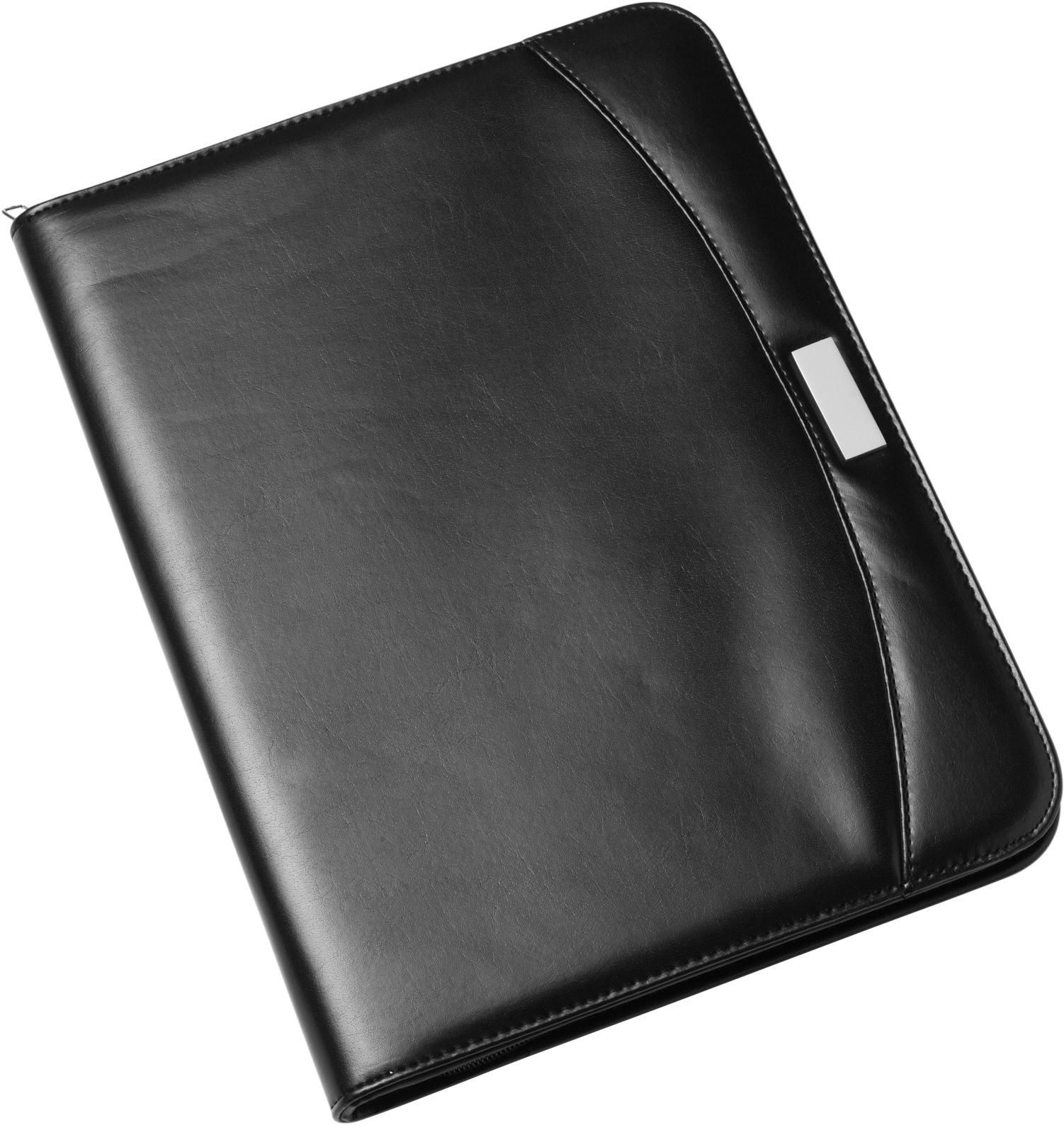 Porta documento (aprox. A4) de pele regenerada com bloco de 50 folhas, calculadora e fecho de correr. Esferográfica não incluída.