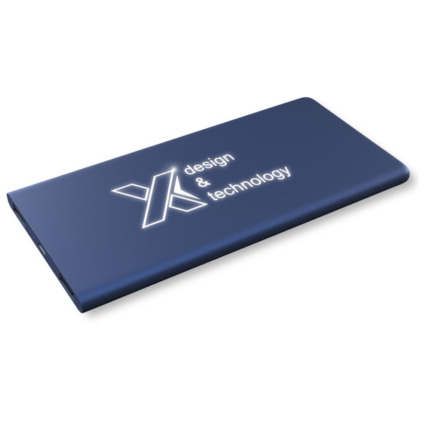 Powerbank ultrafino e ultraleve aborrachado, com logótipo retroiluminado e um cabo 5 em 1 em plástico RPET. O dispositivo ilumina-se quando é tocado devido à sua "função de vibração" e o logótipo pode permanecer iluminado até 20 dias sem recarregar a bateria. Capacidade: 5000 mAh. Saída CC dupla: 5V/2A e 5V/2A carregamento rápido. Entrada CC: Micro-USB de 5 V/2A. Peso líquido: 110 gramas. Tamanho: 138 x 66 x 8,5 mm. Disponível com uma caixa de presente produzida em papel reciclado.