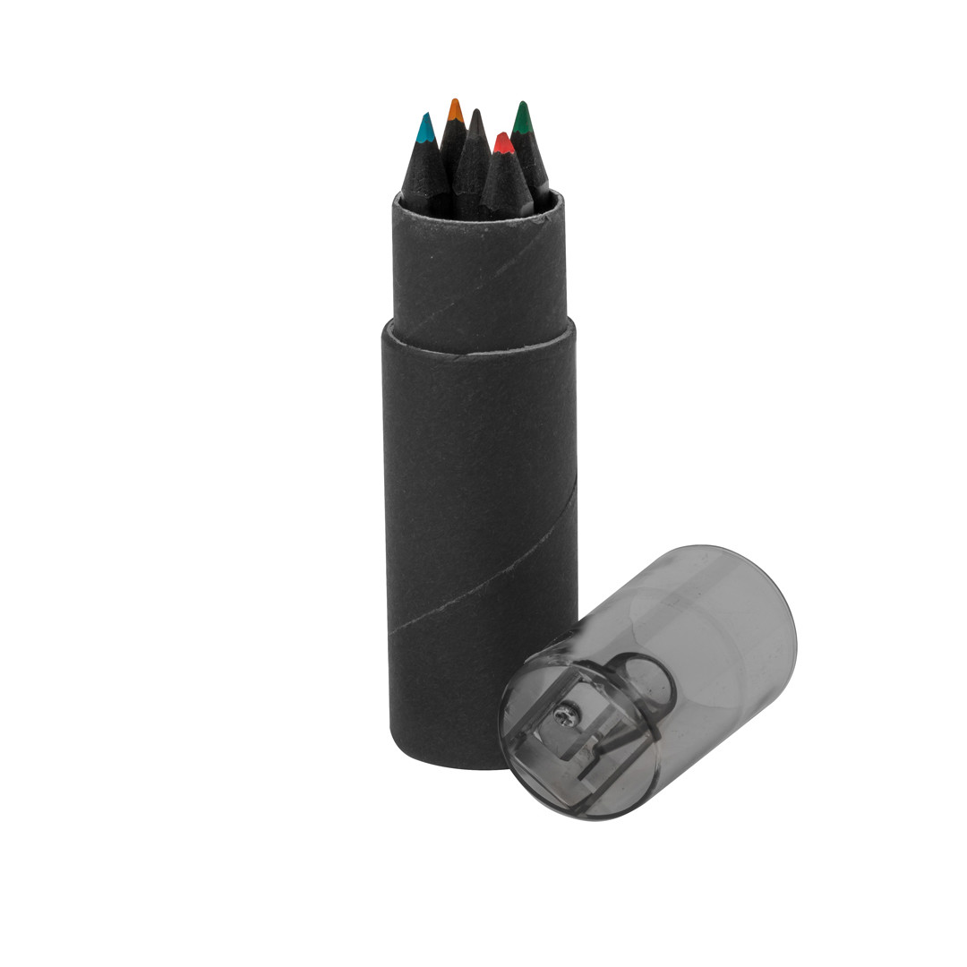 Set de 6 lápis de madeira com acabamento em preto, corpo hexagonal e minas em diversas cores. Apresentado num estojo cilíndrico de cartão reciclado preto, com tampa transparente a condizer e afiadeira integrada. 7 Peças