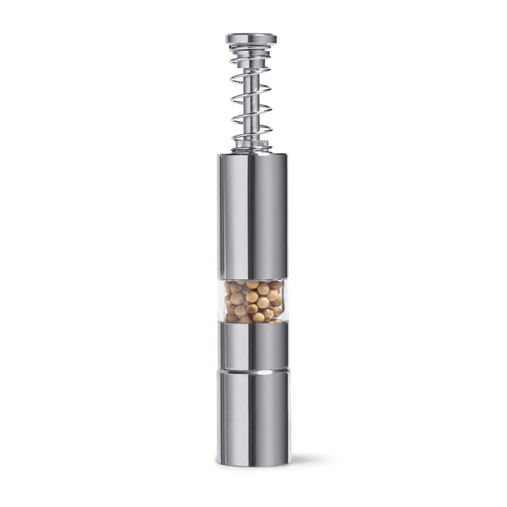 Moinho para especiarias em aço inoxidável. O recipiente em PS, no interior do moinho, permite conservar a especiaria e utilizar conforme necessário. ø27 x 153 mm