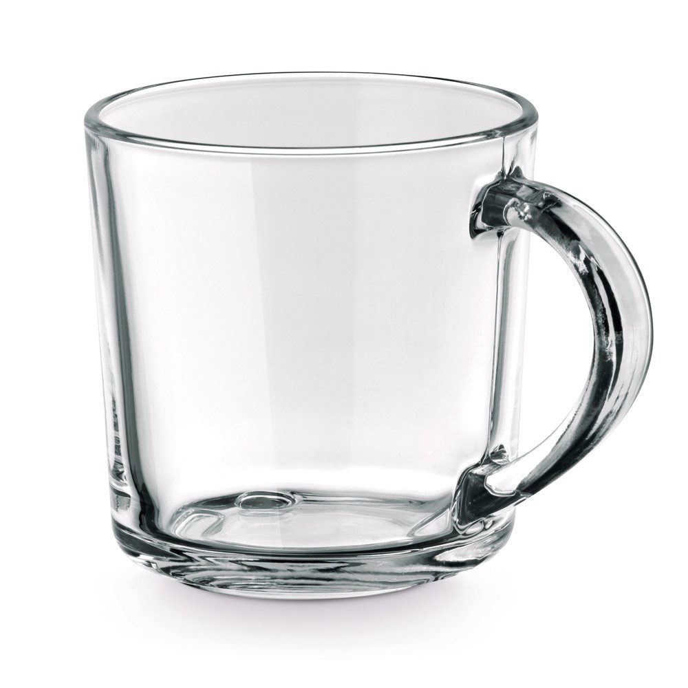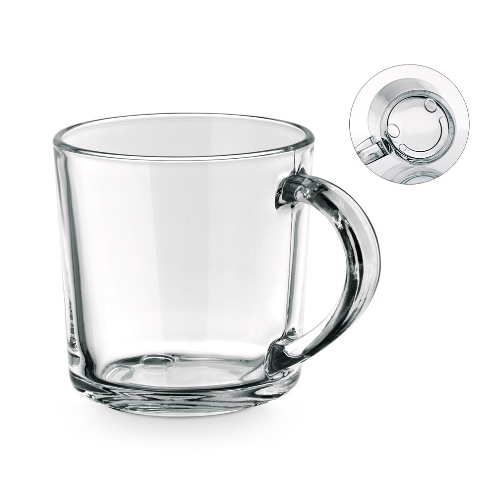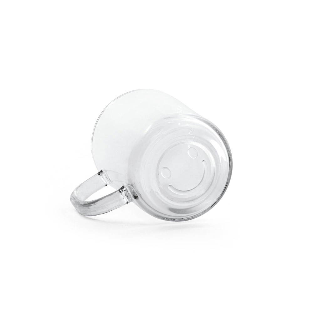 Caneca em vidro com smile na base e capacidade até 230 mL. Fornecida em caixa de oferta. ø72 x 89 mm | Caixa: 75 x 95 x 92 mm