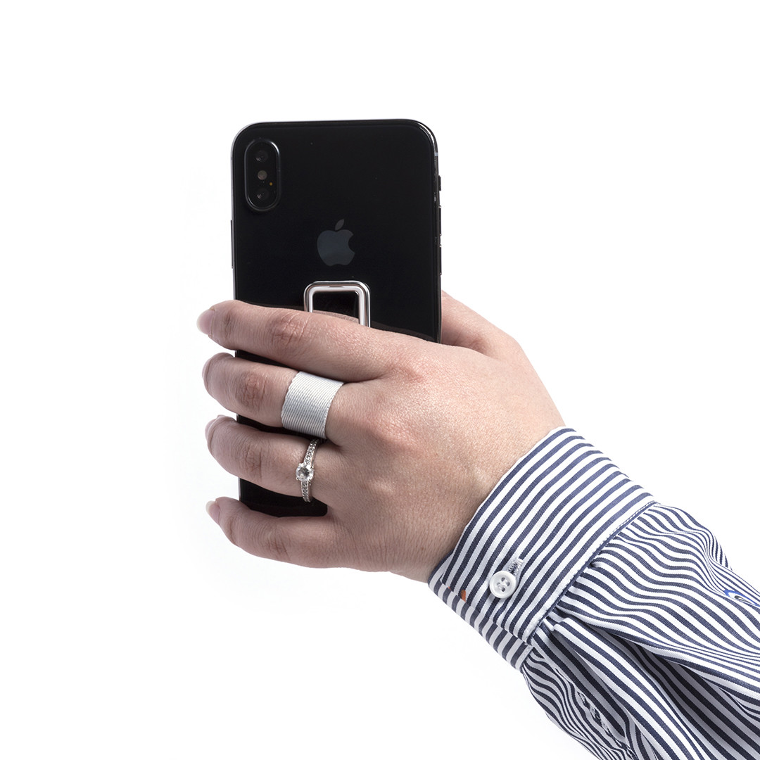 Original suporte adesivo para smartphone com fita em poliéster resistente para selfies e área central para impressão. Com suporte metálico e apresentado em bolsa atrativa. Adesivo