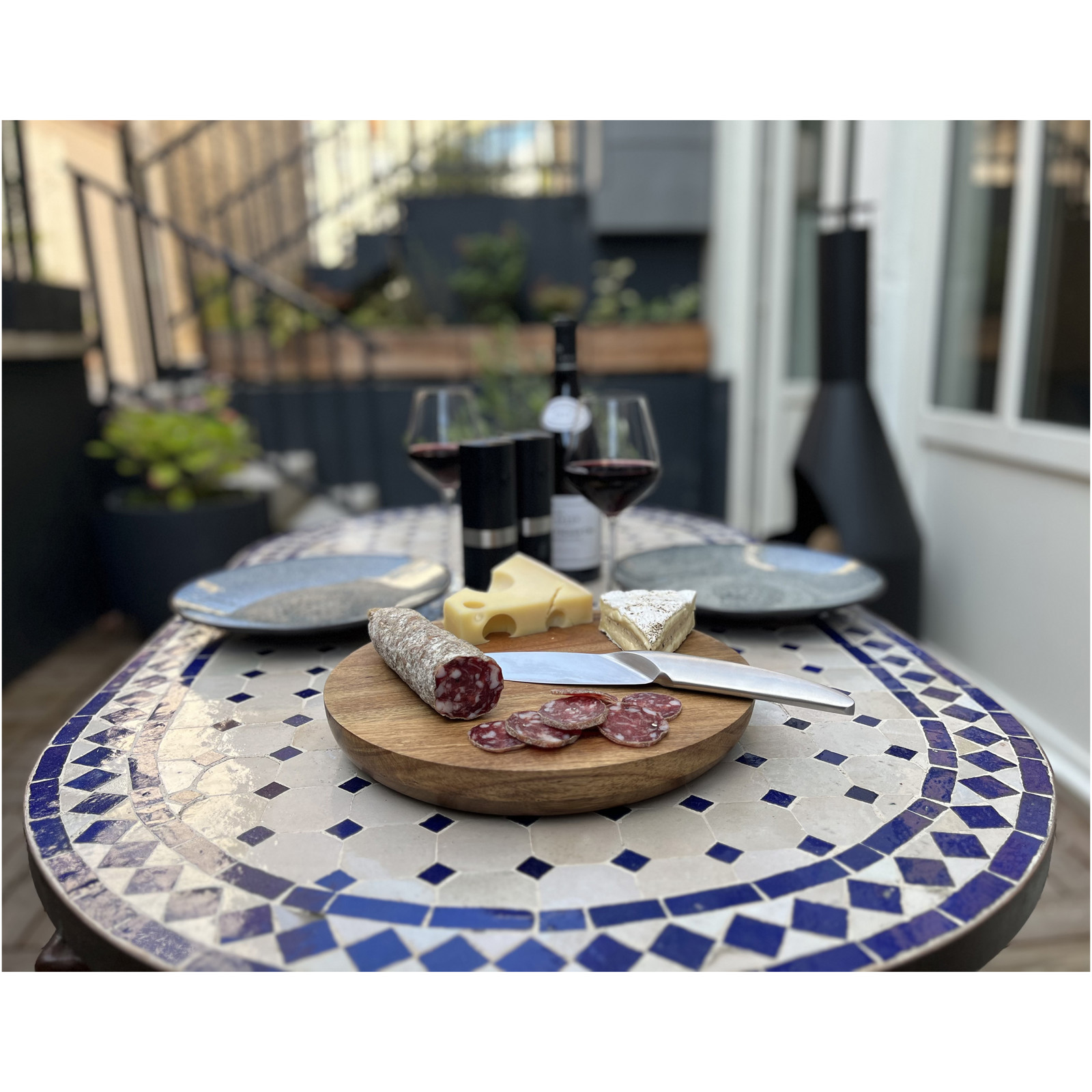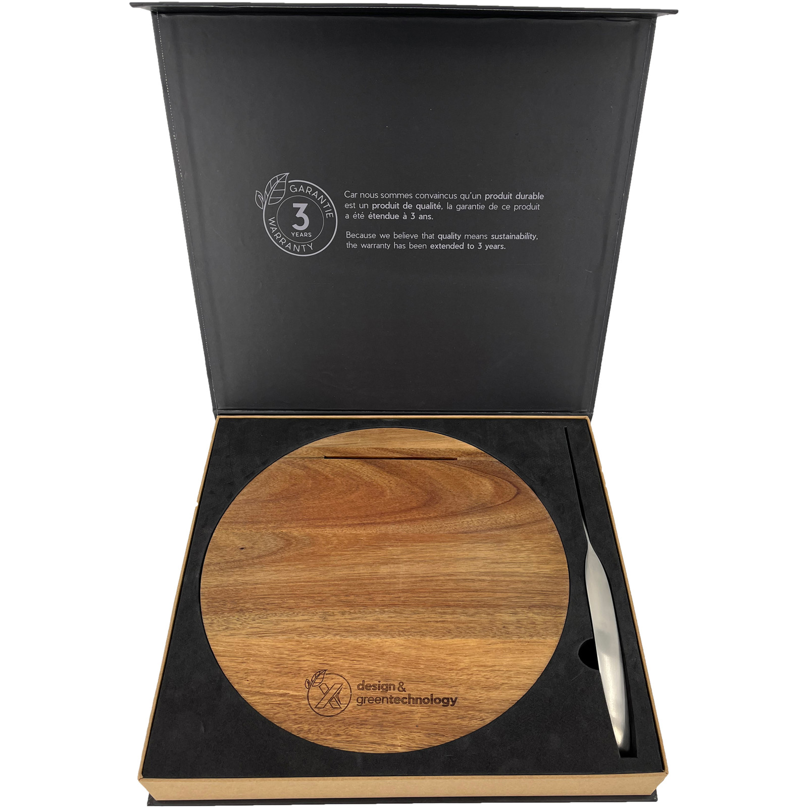 Conjunto exclusivo de tábua de cortar em madeira de acácia e conjunto de facas de aço inoxidável. Este produto é personalizável com um logótipo estampado. A tábua de cortar (30 cm de diâmetro e 4 cm de altura) foi projetada com um encaixe (30,4 x 4 x 2 cm) onde a faca pode ser armazenada após o seu uso. Ambos os produtos são embalado numa caixa de presente de papel reciclado (36,8 x 33,5 x 5,1 cm) com fecho magnético. Inclui 3 anos de garantia.