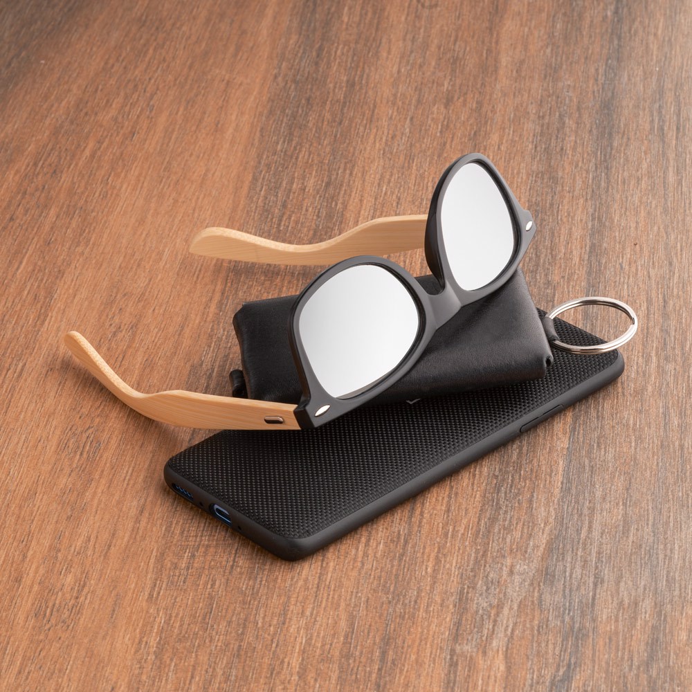 Óculos de sol com armação em PP e bambu. Lentes espelhadas de categoria 3 e UV400 de proteção. Em conformidade com as normas EN ISO 12312-1. Por ser um produto composto por materiais naturais, a cor do produto e o resultado da impressão podem variar entre produtos. 146 x 49 x 150 mm