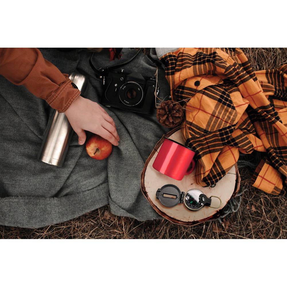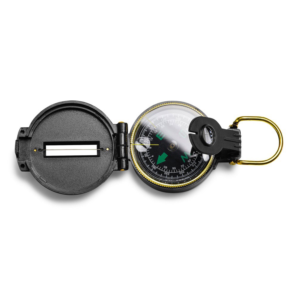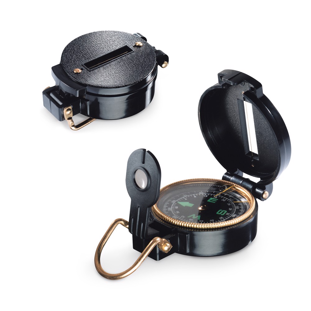 Bússola em ABS com ranhura de observação na tampa e lente de aumento. Detalhes em dourado. Fornecido em caixa de oferta. ø55 x 25 mm